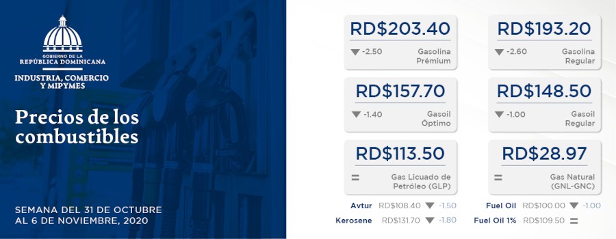 Para la semana del 31 de octubre al 6 de noviembre, el MICM ha dispuesto que la gasolina regular se venda a 193.20 y la premium a 203.40, para una rebaja de 2.60 y 2.50 pesos por galón respectivamente; mientras que, el galón de gasoil regular bajará 1.00 peso para venderse a 148.50 y el Optimo a 157.70, descendiendo 1.40 pesos por galón. Así mismo, el gas licuado de petróleo (GLP) mantendrá su precio, y se venderá a 113.50 pesos por galón.