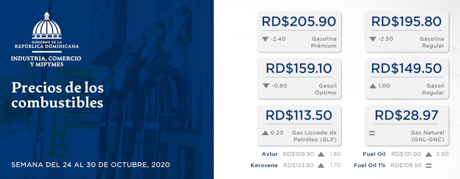Para la semana del 24 al 30 de octubre, la gasolina regular se venderá a RD$ 195.80 y la premium a RD$ 205.90 para una rebaja de 2.50 y 2.40 pesos por galón respectivamente; mientras que el galón de gasoil regular subirá RD$ 1.00 peso para venderse a RD$ 149.50 y el Optimo a RS$ 159.10 descendiendo 60 centavos. El gas licuado se venderá a RD$ 113.50, un ligero incremento de 20 centavos por galón.
