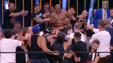 Enloqueció Mike Tyson en la lucha libre: rompió su camiseta, cruzó insultos e inició una batalla campal de 20 personas