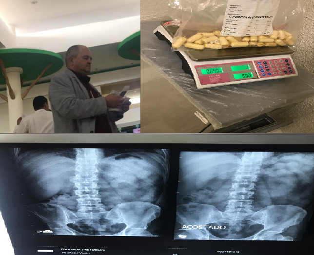 El extranjero Todorov Svetoslavmr pretendía volar con destino a Bruselas, Bélgica y fue detenido en el puesto de migración de la terminal Alfa y se le realizó una radiografía en el Body Scan, arrojando resultado positivo de cuerpos extraños, en su estómago e intestinos.