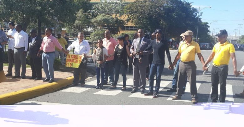 La cadena humana es en protesta contra la corrupción, llevada a cabo por algunas organizaciones en gran parte del país, después del escándalo que desató el suicidio dentro de la sede de la Oficina de Ingenieros Supervisores de Obras del Estado (OISOE) del arquitecto David Rodríguez, que atribuyó su decisión, según una carta que dejó, a las deudas por los altos intereses de los préstamos que le hacían funcionarios de esa misma institución del Estado.