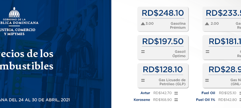 Para la semana del 24 al 30 de abril 2021, el Ministerio de Industria, Comercio y MiPymes dispone que los combustibles se comercialicen a los siguientes precios:
