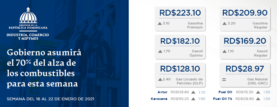 Para la semana del 16 al 22 de enero 2021, el promedio de los precios del barril de petróleo tuvo variación considerable con relación a la semana anterior, incrementando los precios en un 7% aproximadamente, razón por la cual, el Ministerio de Industria, Comercio y Mipymes informó que, a partir del próximo sábado 16, la gasolina regular se venderá a 209.90 y la premium a 223.10 pesos, incrementando en 3.20 y 3.10 por galón, respectivamente. El Gasoil Regular se venderá a 169.20 y el óptimo a 182.10 aumentando 1.10 y 1.70 pesos por galón respectivamente. Mientras que, el Gas licuado de petróleo, se dispensará a 128.10 pesos por galón subiendo 2.40, por último, el gas natural mantiene su precio de 28.97 el metro cubico.