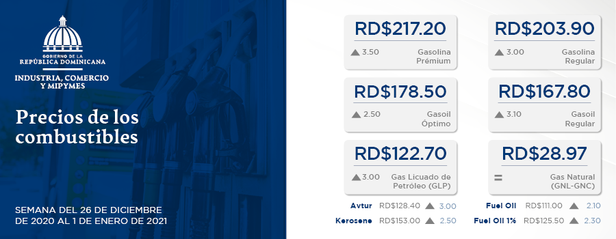 Para la semana del 26 de diciembre al 1 de enero 2021, el promedio de los 5 días del barril de petróleo se colocó 0.91 dólares por encima de la semana anterior equivalente a 1.93 % de incremento. Por ende, a partir de este sábado, el MICM informa que, la gasolina regular se venderá a 203.90 y la premium a 217.20, para un incremento de 3.00 y 3.50 por galón respectivamente; mientras que el galón de gasoil regular subirá 3.10 para cotizarse a 167.80 y el Optimo a 178.50, subiendo 2.50 pesos por galón; el gas licuado se dispensará a 122.70 aumentando 3.00 pesos por galón. Por último, el gas natural mantiene su precio de 28.97 el metro cúbico.