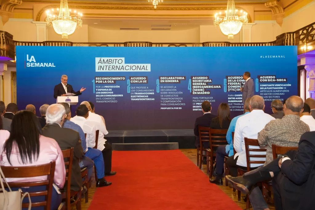 Los avances en materia de defensa del consumidor se sienten a nivel internacional y han recibido el conocimiento de la OEA por la protección y defensa de los derechos de los consumidores en el comercio transfronterizo. Además, se logró un acuerdo con la Unión Europea para proteger a los consumidores en transacciones electrónicas transfronterizas y en la Declaratoria de Ginebra se acogió la declaración sobre resolución de conflictos transfronterizos y compensación para consumidores, que fue propuesta por la República Dominicana.