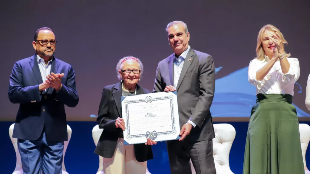 El reconocimiento a los aportes de Rhina Espaillat fue otorgado mediante el Decreto 642-24, emitido por el presidente Abinader y leído en el acto por el consultor jurídico del Poder Ejecutivo, Antoliano Peralta.