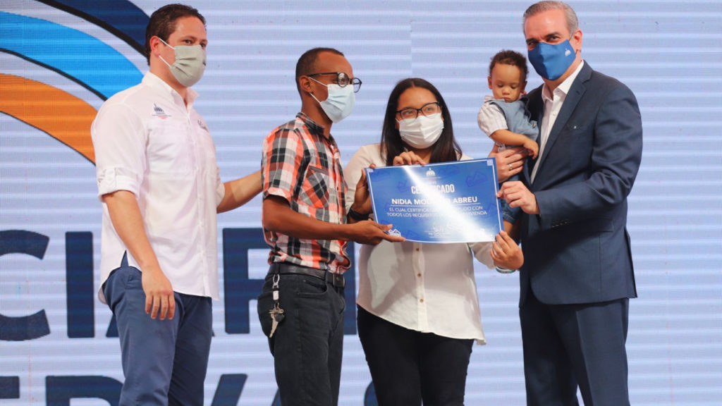 En la actividad, el presidente Abinader y el director general del INVI, Carlos Bonilla Sánchez, hicieron entrega de certificados simbólicos de propiedad de viviendas a las familias representadas por Cintia Santana Báez, Nidia Modesto, Jeremías Isaac Díaz y Santa Agustina Ferreras.