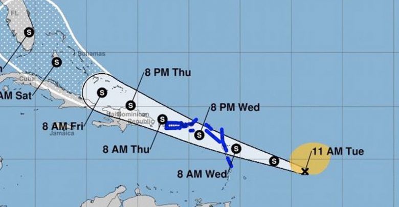 El patrón de trayectoria indica que esta noche pasará por el sur de Puerto Rico y el jueves estará cerca o sobre La Española.
