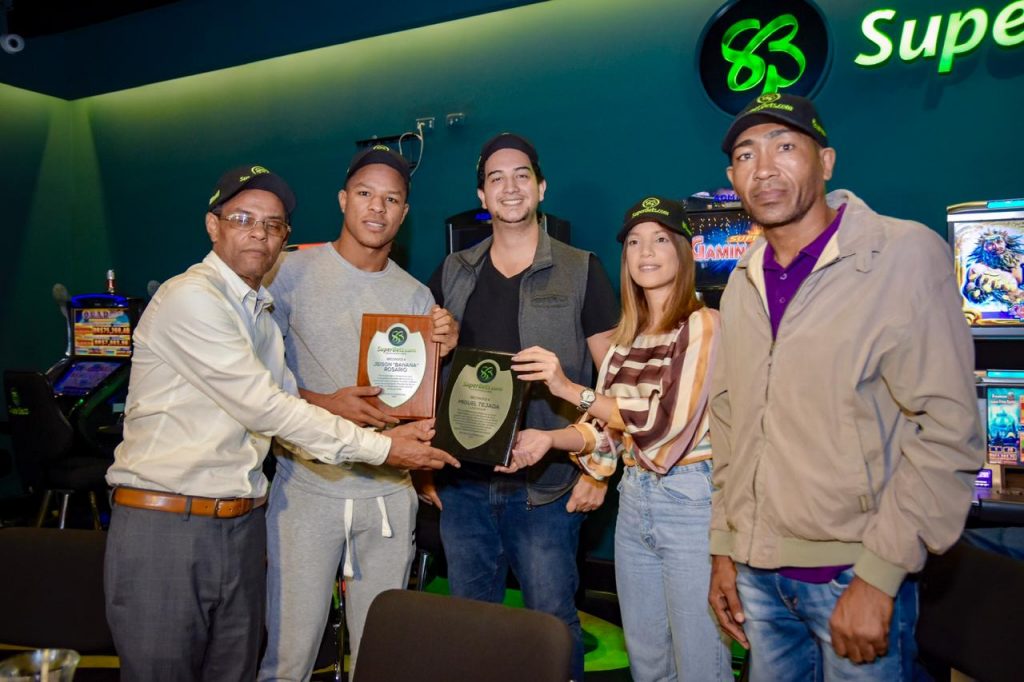 SANTO DOMINGO.-El triple campeón mundial del peso mediano junior (154 libras), Jeison “Banana” Rosario y su manejador César “Manguita” Mercedes, fueron reconocidos por la empresa SuperBets durante un acto celebrado el pasado miércoles.
