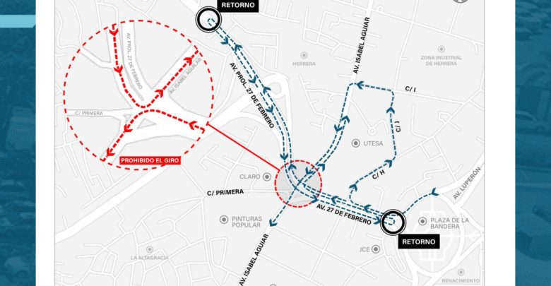 Mientras, los que transiten y quieran girar al Sur de la avenida Isabel Aguilar, desde el Este, en la avenida 27 de Febrero, deberán tomar la “Calle H” hacia el Norte, doblar a la izquierda en la “Calle J” y luego y retomar la izquierda en la Isabel Aguilar hacia el Sur.