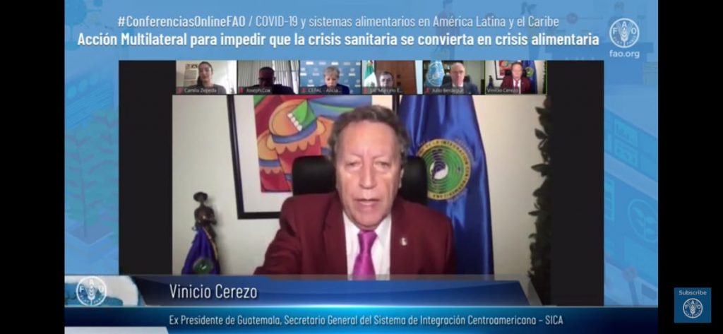 Así lo enfatizó el Secretario General del SICA, Vinicio Cerezo, en su intervención en el Seminario Virtual: “Acción multilateral para impedir que la crisis sanitaria se convierta en una crisis alimentaria”, organizado por la Comunidad de Estados Latinoamericanos y Caribeños (CELAC) y la Organización de las Naciones Unidas para la Alimentación y la Agricultura (FAO, por sus siglas en inglés).